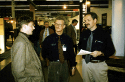 Ett svenskt företag på plats var också Bentone som visade upp en miljöprofilerad snygg monter i trä. I HS Tarms monter fanns Magnus Granehed från Penfal, som visade en ny fastbränslestoker med panna. CTC visade sitt vedprogram. Intressant var att tre pelletkamintillverkare från USA gjorde gemensam sak tillsammans i en monter. På bilden ovan ses Stefan Andreasson, Janfire-Ardeo, samtala med mr Whitfield och en europeisk Whitfieldrepresentant. |